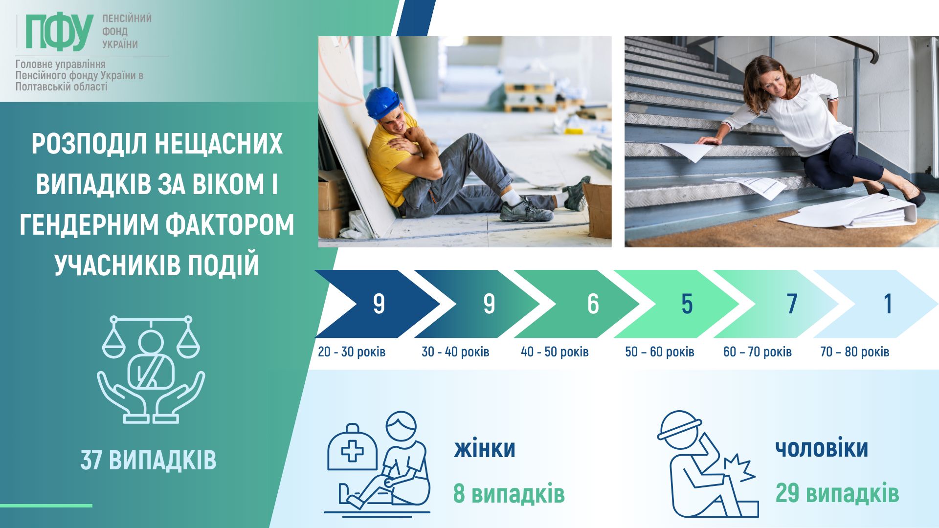 Природним є те, що найбільше випадків травматизму протягом півріччя трапилося з людьми віком від двадцяти до сорока років – тобто, найбільш продуктивного і працездатного віку. Однак це черговий сигнал про те, що саме молодь потребує постійної уваги в рамках проведення профілактичних заходів на підприємствах щодо попередження нещасних випадків.