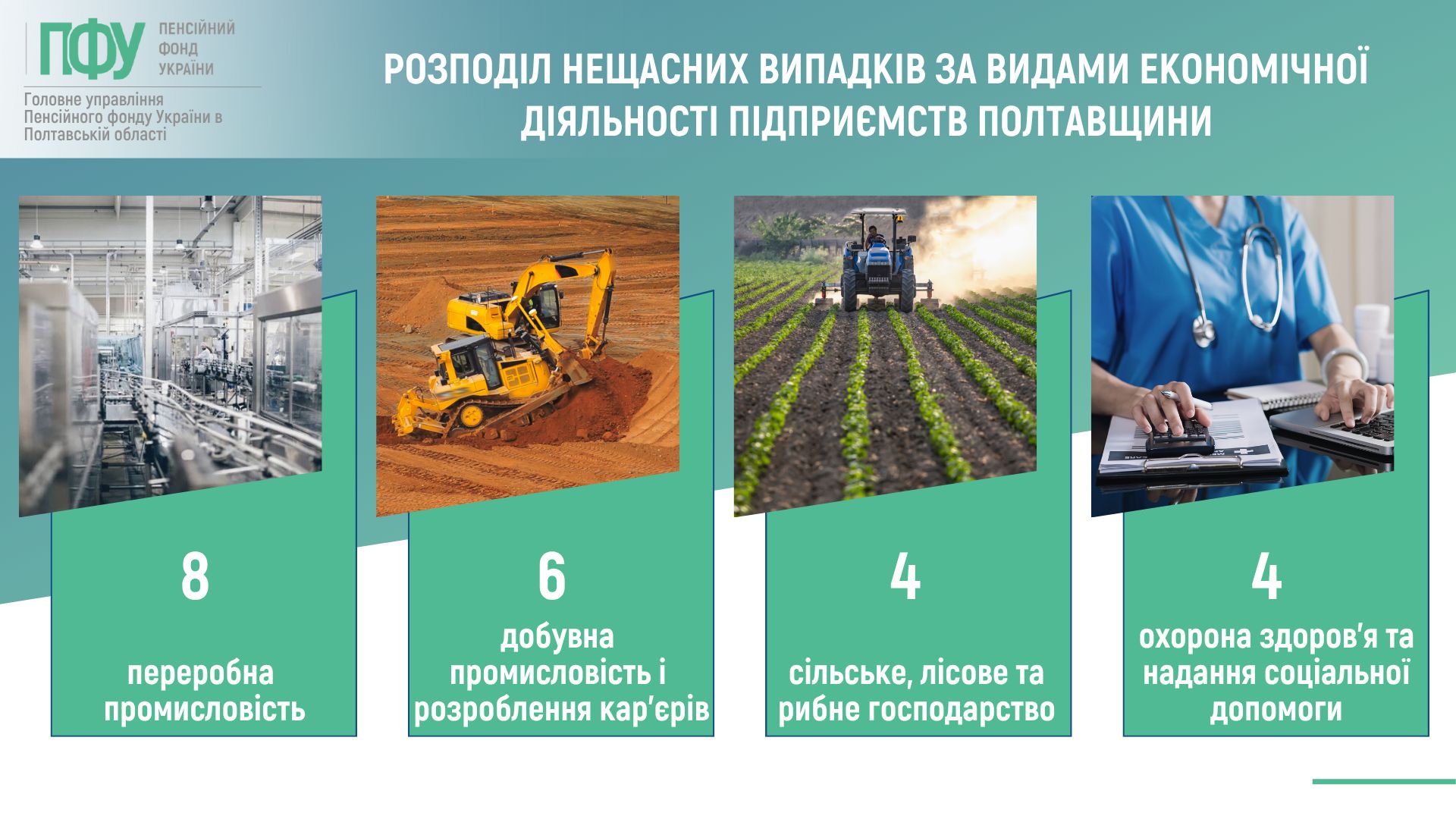 Як свідчить аналіз, проведений у Головному управлінні, протягом І півріччя 2025 року найбільше випадків травматизму сталося на підприємствах переробної промисловості (8), добувної промисловості і розробленні кар’єрів (6), сільського, лісового та рибного господарств (4).