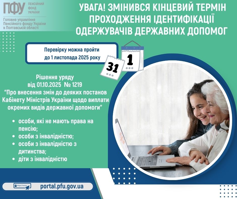 Зважаючи на великий обсяг робіт та технічні складнощі, уряд продовжив терміни фізичної ідентифікації одержувачів державних допомог. Відповідно до постанови від 1 жовтня № 1219 “Про внесення змін до деяких постанов Кабінету Міністрів України щодо виплати окремих видів державної допомоги”, замість 1 жовтня перевірку можна буде пройти до 1 листопада 2025 року.