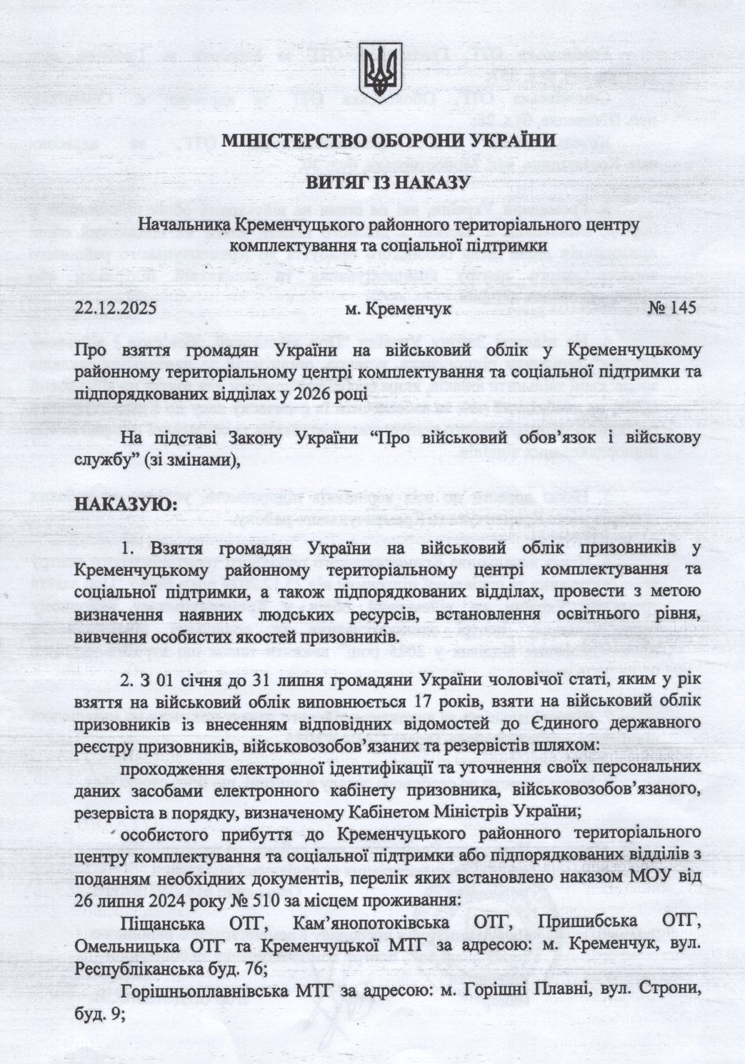 Про взяття громадян України на військовий облік у Кременчуцькому районному територіальному центрі комплектування та соціальної підтримки та підпорядкованих відділах у 2026 році