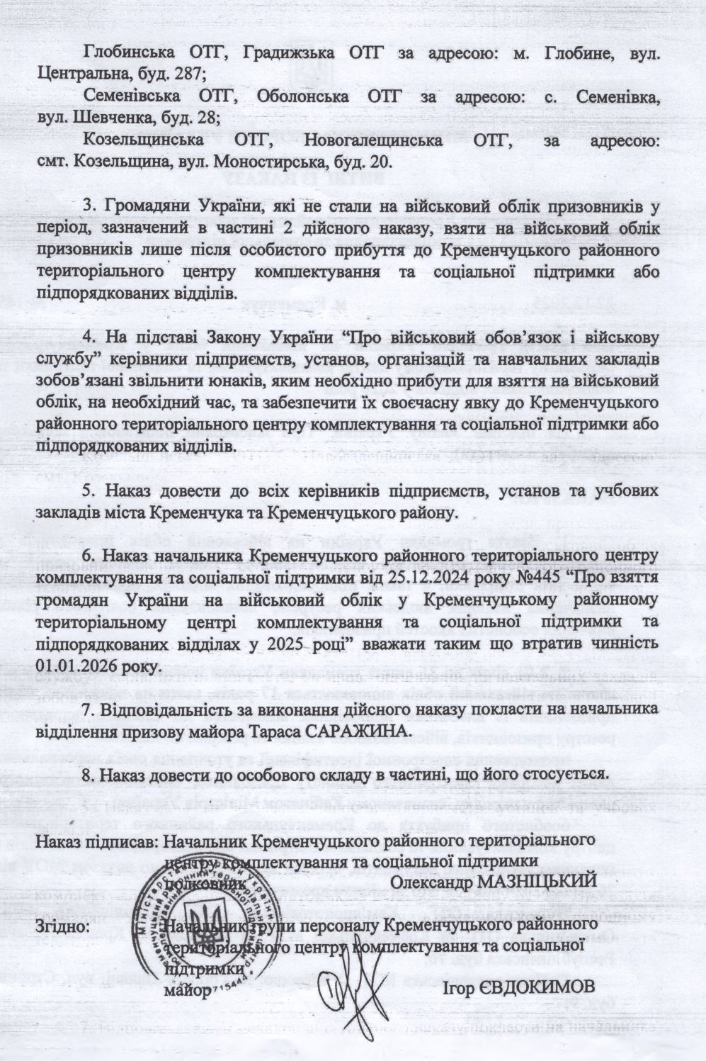 Про взяття громадян України на військовий облік у Кременчуцькому районному територіальному центрі комплектування та соціальної підтримки та підпорядкованих відділах у 2026 році