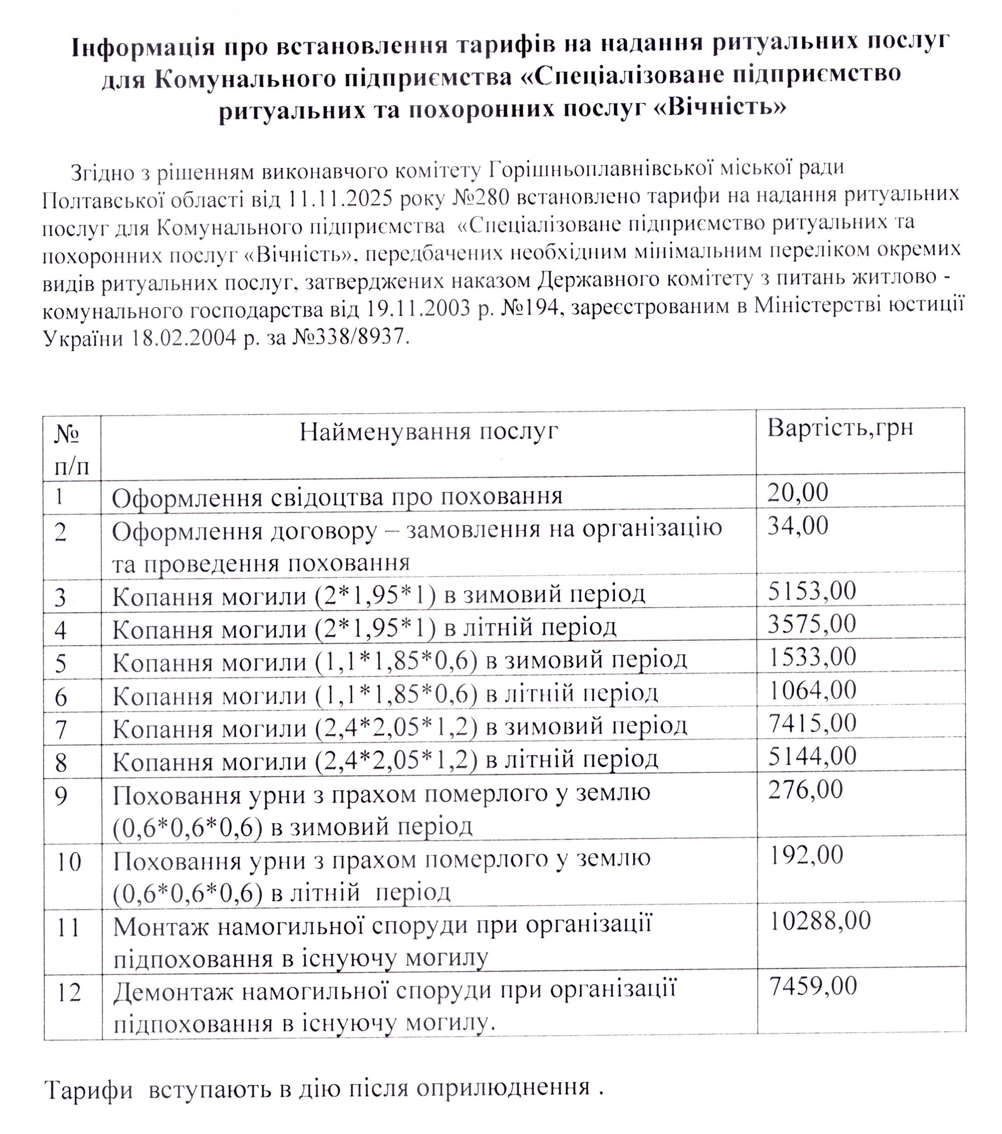 Інформація про встановлення тарифів на надання ритуальних послуг для Комунального підприємства «Спеціалізоване підприємство ритуальних та похоронних послуг «Вічність»